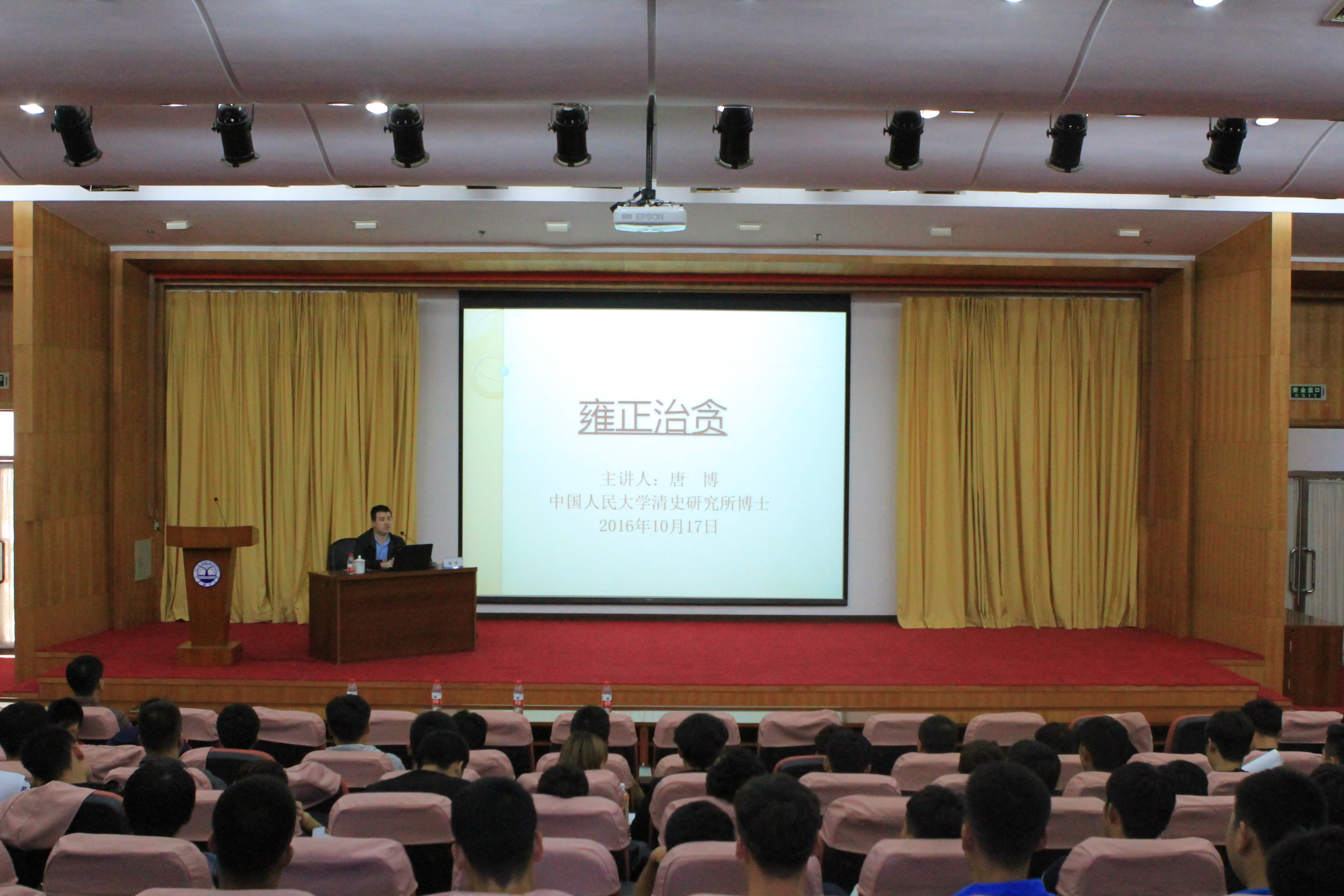 唐博用短短两个小时的时间从雍正其人,治贪原因,治贪方法以及后人评说几个方面为我们讲述了雍正执政期间治贪的一些事迹,让我们对“四爷”雍正治贪有了更深入的了解。整场讲座风趣幽默,引人入胜,报告厅内座无虚席。
