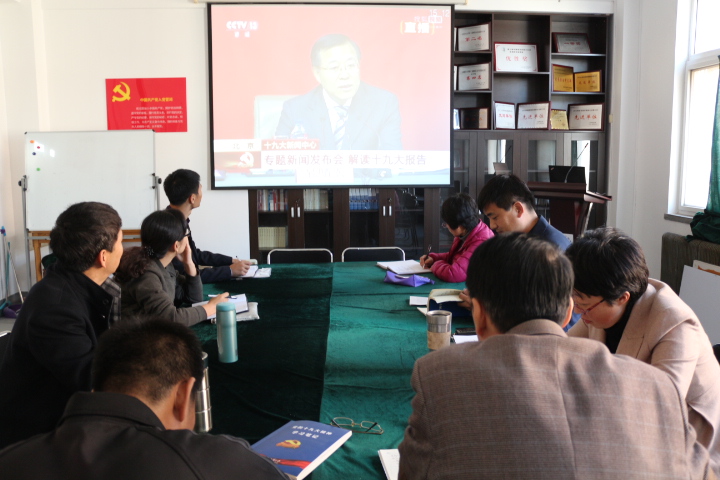 会上,李俊柱带领与会成员观看“中国共产党第十九次全国代表大会新闻发布会”视频。视频中,中央纪委副书记肖培,中央政策研究室常务副主任、中央宣传部副部长王晓晖,中央文献研究室主任冷溶,国务院法制办公室党组书记、副主任袁曙宏,中央财经领导小组办公室副主任杨伟民,中央纪委驻国资委纪检组组长、国资委党委委员江金权解读十九大报告,并回答记者提问。李俊柱总结发言中指出,几位领导的十九大报告解读极其深刻,要把学习宣传贯彻好党的十九大精神,作为当前和今后一个时期的首要政治任务,紧紧抓在手上、牢牢记在心上,充分发挥学员党总支中心组学习的示范带动作用和舆论宣传的引导作用,推动全院学习宣传贯彻十九大精神的全面开展。