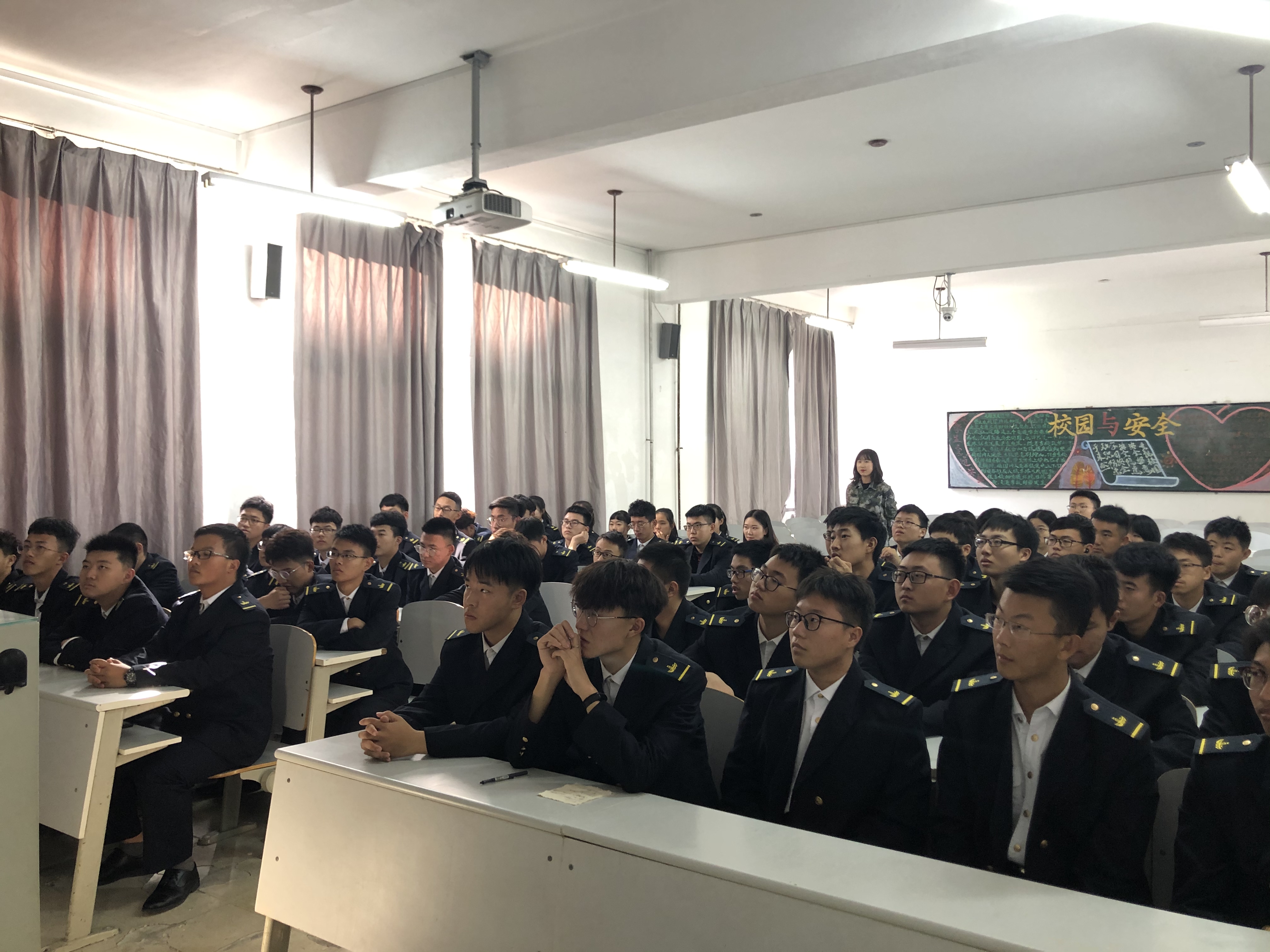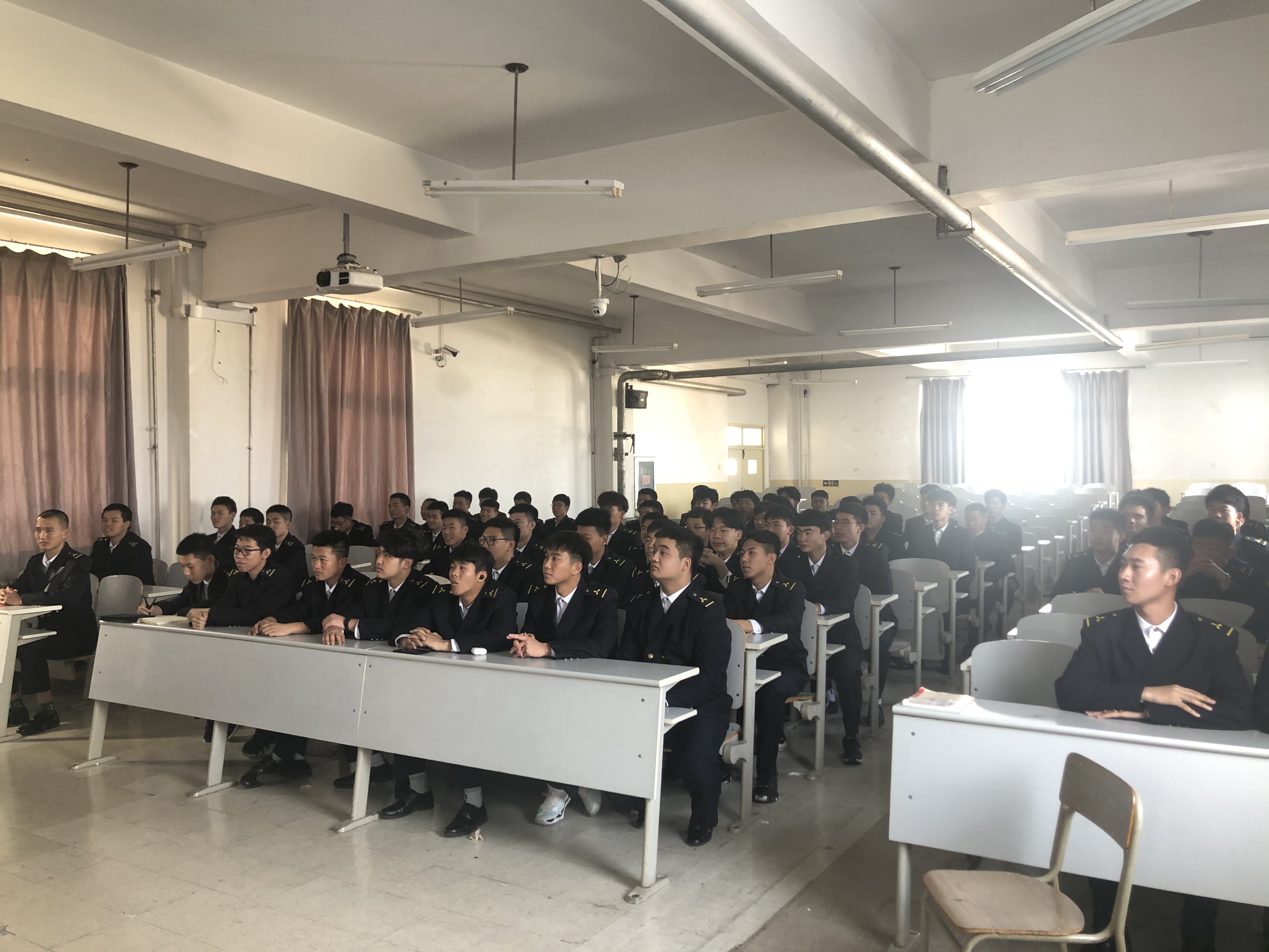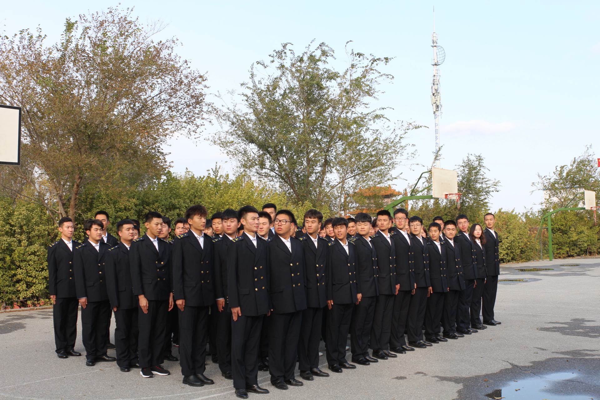 下午一点,同学们身着航海服于训练场集合完毕。训练在教官的“军姿准备”命令中开始。同学们精神抖擞,坚定的目光、挺拔的军姿展现了我院半军事化管理的成果。训练内容包括站军姿、齐步走、停止间转法、正步走等。
