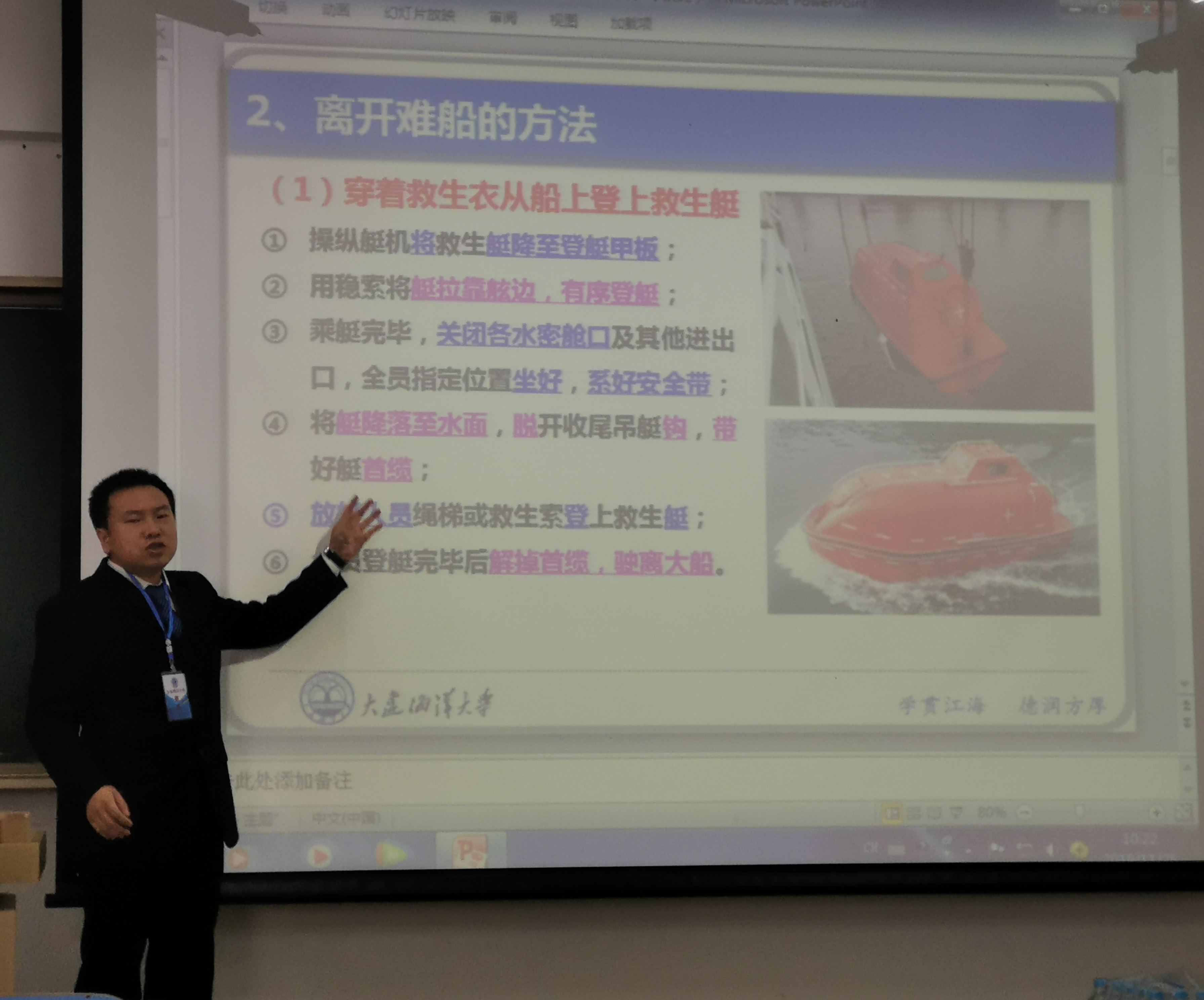 本次比赛分理论教学、实操教学两个大项。在理论教学评比中,于洪亮老师讲授的“弃船时登乘救生筏的方法和技巧”赢得了评委们的一致好评;在实操教学演练中,学生队员在孙康和丁纪铭老师的带领下,顺利地完成了5米高台跳水,水中漂流待救、扶正倾覆救生筏并登乘、移动救生筏并救助水面求生者等水上求生演练科目,随后又圆满完成了呼吸器的穿戴、灭火器的使用、扑救小型火灾和大型火灾等消防演练科目。最终,经过两天的激烈角逐,我校获得第二名的好成绩,并且此次大赛成绩也将作为海事局对我校船员培训质量评价的重要依据。