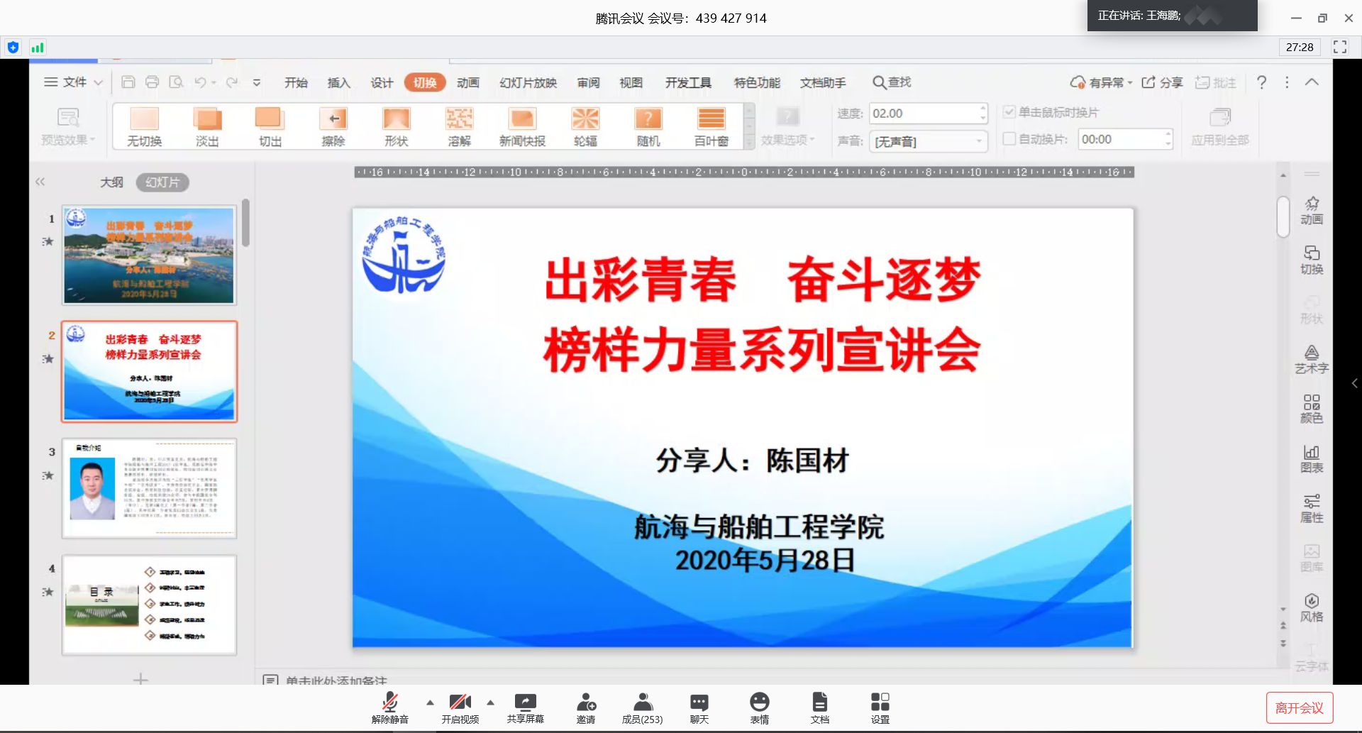 通过腾讯会议平台组织召开了“出彩青春奋斗逐梦”榜样力量系列宣讲会。会议由学院党总支副书记王海鹏主持,学院2019级全体同学参加,学生会副主席陈国材进行了系列宣讲会的第一讲。