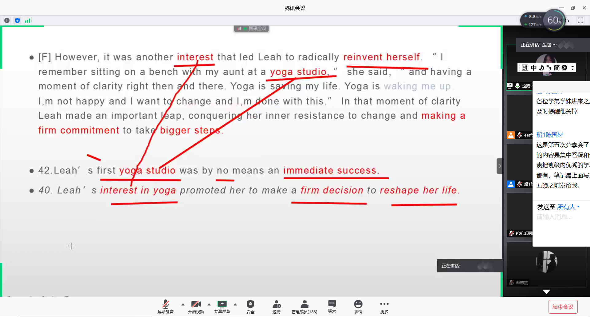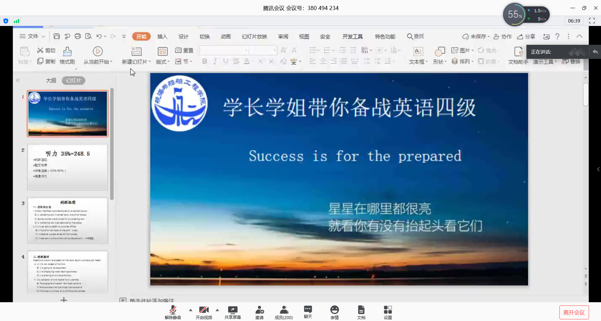 会议伊始,王靖程、李锲两名同学表示很荣幸与同学们分享自己的备考经验。两名同学首先对四级考试的听力、完型填空、阅读理解、选择题和作文四个方面进行详细解读。随后利用对四级考试中的真题详细讲解,结合自身的做题流程,向同学们展示了在考试中做题技巧的重要性。同时重点强调英语四级考试中知识点较为零碎,需要大家养成自觉学习英语的好习惯,通过查漏补缺,把知识真正融会贯通,才能为通过四级考试打下良好的基础。会议最后,主讲人们不仅在解疑环节中,对同学们在四级考试中的困难、疑惑进行详细解答,还向参会同学们展示了多名优秀学生的学习笔记。