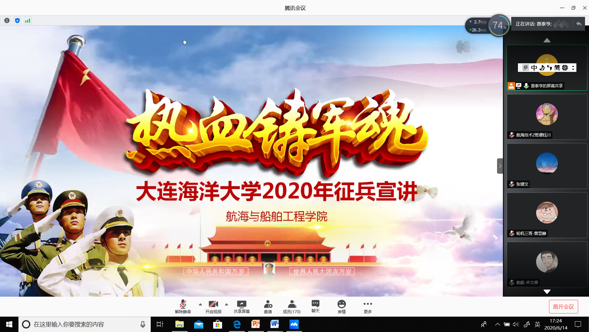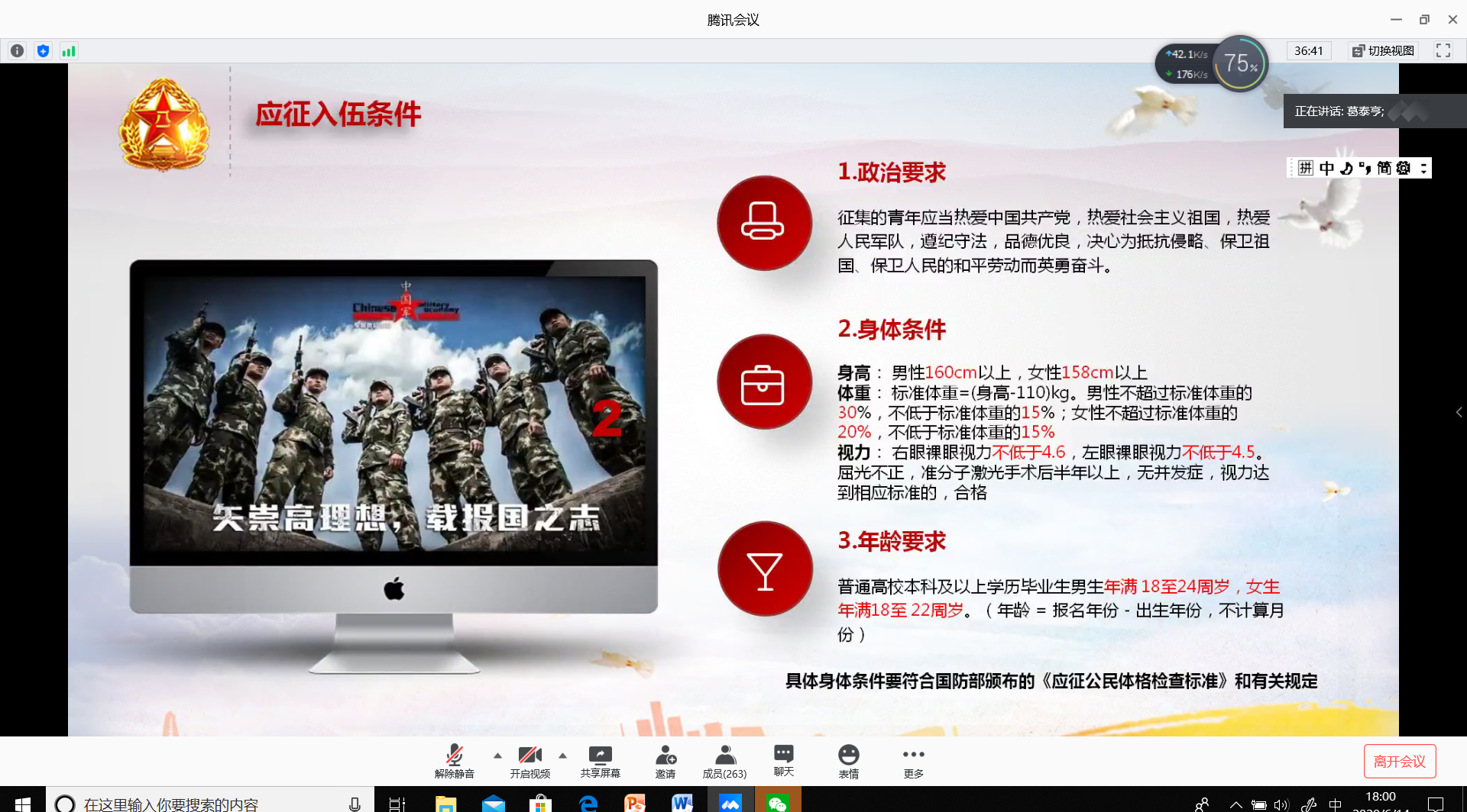 为深入贯彻落实关于大学毕业生征兵工作的指示精神、激发广大适龄大学生参军卫国的热情,使优秀学子积极响应祖国号召参军入伍、携笔从戎。我院在6月14日通过腾讯会议,召开“麻豆传媒 2020年征兵宣讲会”。我院党总支副书记王海鹏,辅导员葛泰亨,2020届毕业生以及有应征入伍意向的低年级同学参与此次会议,会议由葛泰亨主讲。
