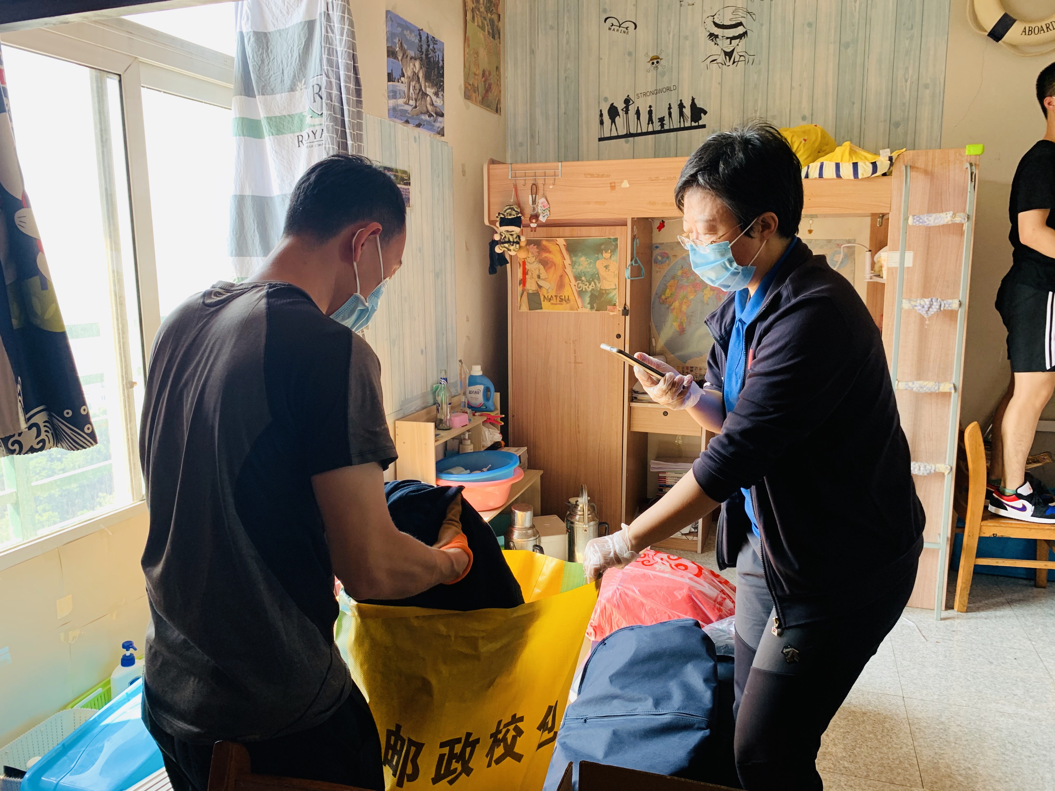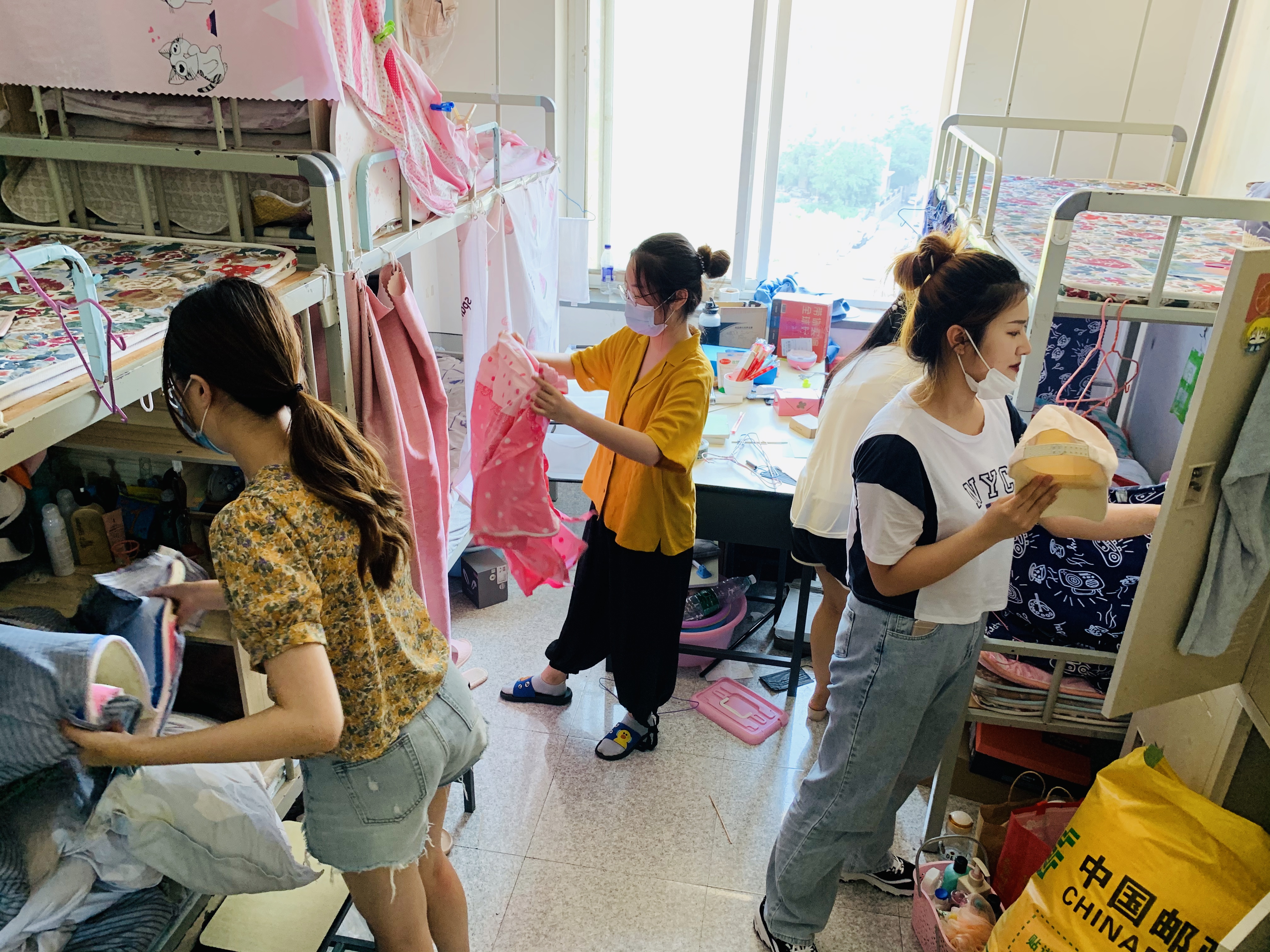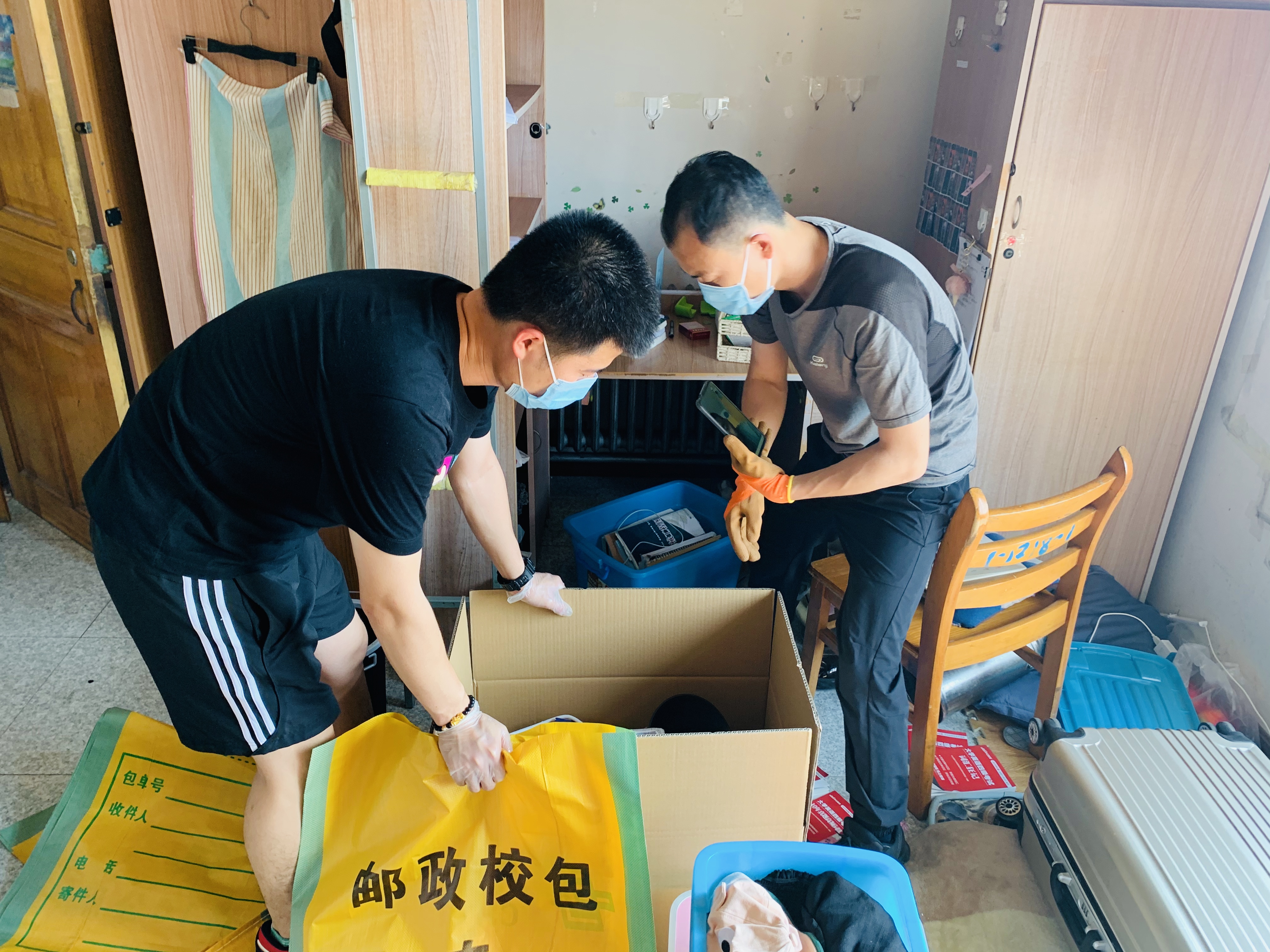 学院领导班子带头,各教研室具体分工,带领各位老师们采用直播打包、多对一服务的形式,积极和学生沟通,亲自动手为学生打包、寄送行李。