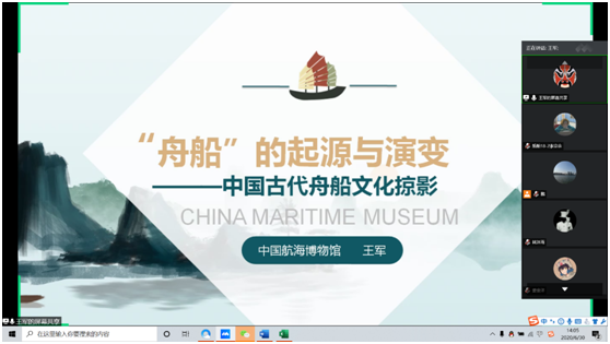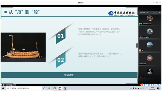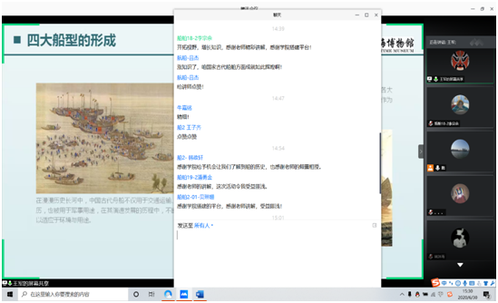 中国航海博物馆以及王军主任带领同学们了解了中国航海技术发明与演变过程分为以匏济水、变乘桴以造舟楫、刳木为舟、方舟而济于河、从舟到船。同时大家还在线目睹了馆内最珍贵的由三公斤黄金打造的大翼战船;认识了沙船,福船,广船,鸟船四大船型的形成以及许多与航海有关的历史人物。讲解全程同学们纷纷为王主任的精彩讲解点赞。