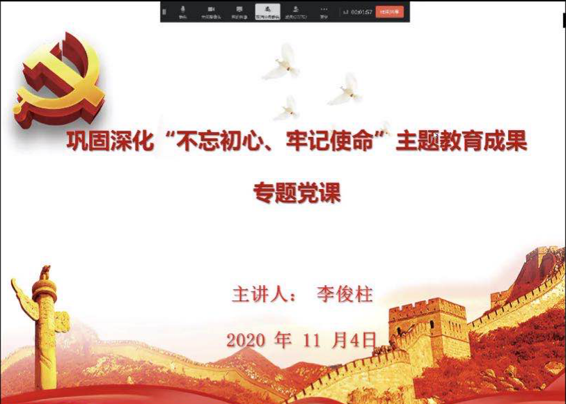11月4日,麻豆传媒 党总支通过钉钉平台开展巩固深化“不忘初心、牢记使命”主题教育成果线上专题党课,学院全体党员参加,党课由党总支书记李俊柱主讲。