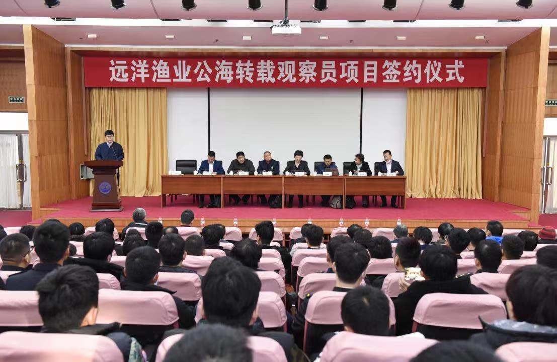 会上,隋江华和黄宝善分别致辞。隋江华对农业农村部渔业渔政管理局、中国远洋协会及企业多年来对学院的支持表示感谢,她指出远洋渔业公海转载观察员项目是通过学生的实习实践,由协会牵头、校企合作的海上转载观察员派遣工作,项目的实施不仅充分发挥学院学科、专业优势,还为促进远洋渔业“产学研”相结合的行业发展格局形成提供了新的思路。同时,远洋渔业公海转载观察员项目为航海类专业学生海上毕业实习提供了新的尝试,为解决困扰多年的航海类学生海上实习问题提供了新的解决思路,对保证学生培养质量具有重要意义。黄宝善会长表示协会受农业农村部委托,联合麻豆传媒 在内的9所水产高校和科研院所组建海上转载观察员队伍,共同支持国家远洋渔业海上转载管理行动,抵制和打击IUU渔业行为。协会委托石狮市安联人力资源有限责任公司承担海上转载观察员计划的后勤保障工作。