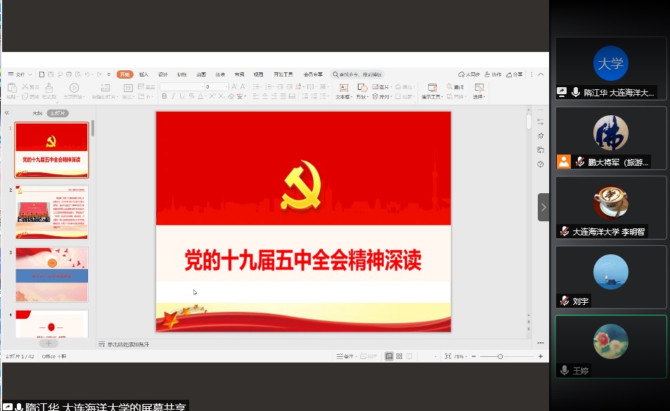 为深入学习贯彻落实党的十九届五中全会精神,按照学院党总支的统一安排,12月20日,轮机党支部利用腾讯会议平台开展了题为“党的十九届五中全会精神解读”—党的十九届五中全会精神宣讲会。轮机工程教研室党支部全体党员参加会议。宣讲会由学院党总支副书记、院长隋江华主讲。