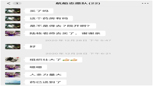 2020年12月28日,校外公寓急需为学生购买药品送到公寓。志愿者陆栋接到任务后,立即出发,由于药品的特殊性,陆老师辗转十数家药房才买到。