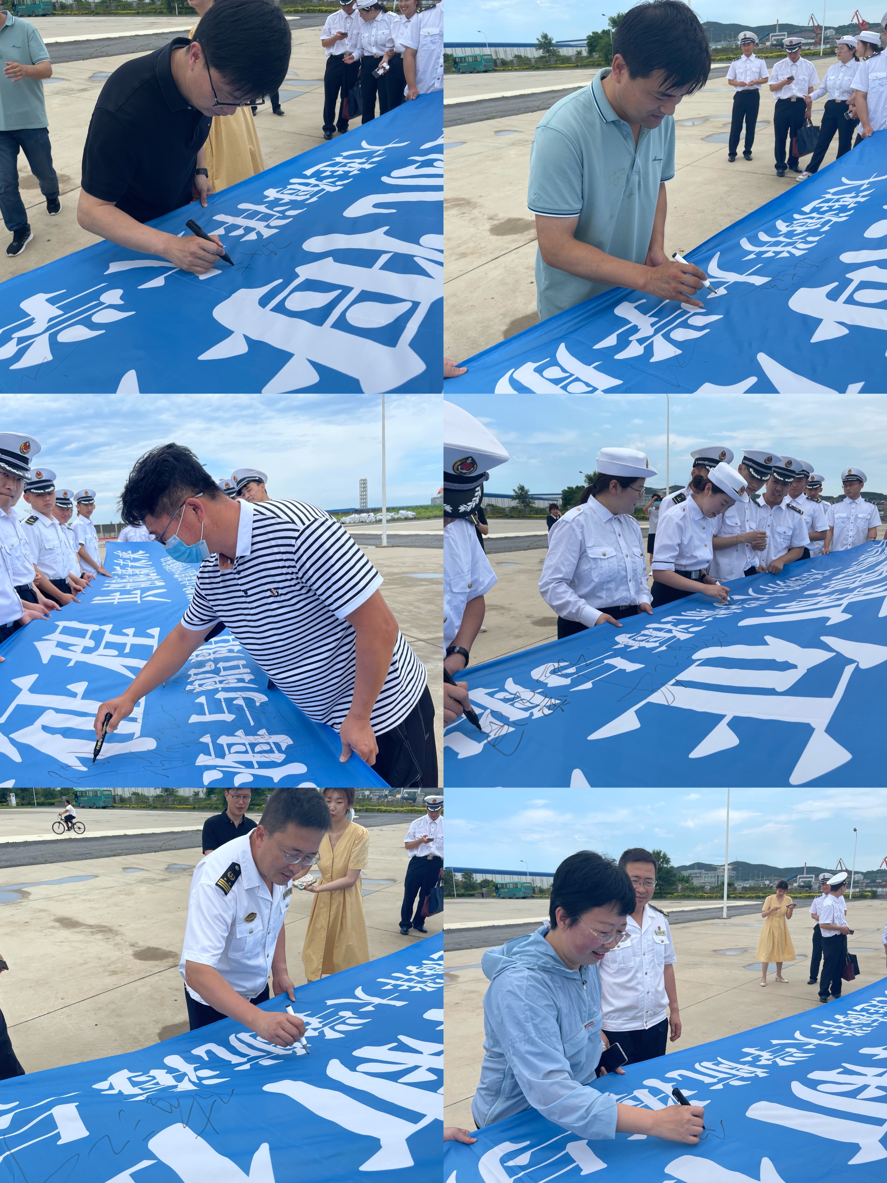 活动伊始,大连海事局旅顺海事处引导员为大家详细讲解海事处的“三容精神”,全体师生对海事文化、航运历史背景以及海洋精神内涵有了更深入地理解。接着,大连海事局旅顺海事处的刘玉珂处长和王军副处长带领全体师生参观海巡船,对内部结构、船内设施使用、行船经验心得等进行了无私分享,并与学院领导班子成员针对航海人才培养、未来前景发展以及航海文化建设进行了充分交流。最后,全体与会者在主题条幅上进行签字留念,活动圆满结束。