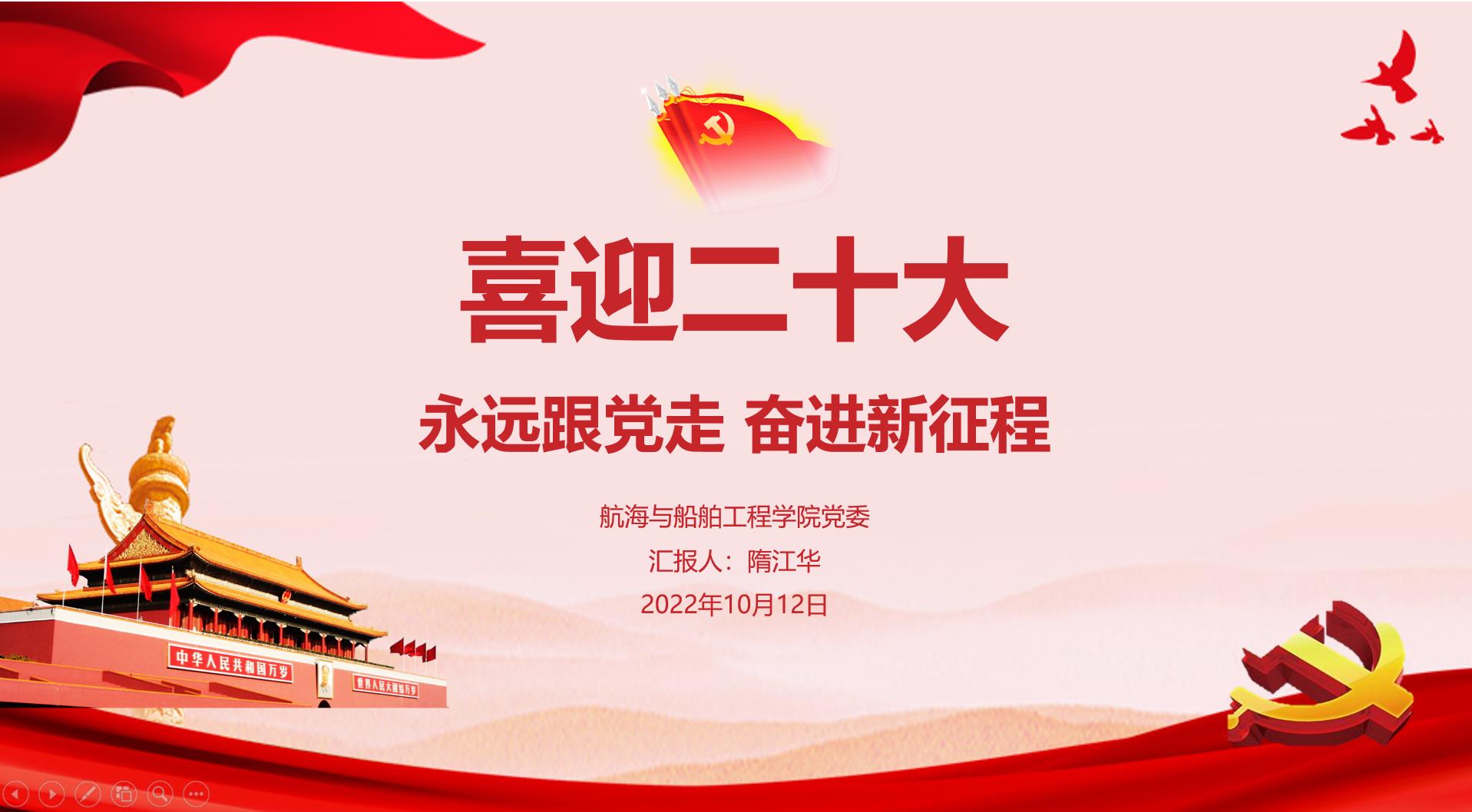2022年是党的二十大召开之年,是奋力迈向第二个百年奋斗目标的关键之年。为了让轮机党支部全体党员以更加坚定的理想信仰、更为崇高的使命追求、更加扎实的政治作风,迎接党的二十大召开,10月12日,隋江华院长为轮机党支部上了一堂题为“喜迎党的二十大 永远跟党走 奋进新征程”的专题党课。