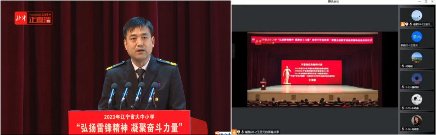 学院组织全体学生线上、线下同时观看了由省委教育工委主办的2023年辽宁省大中小学“弘扬雷锋精神 凝聚奋斗力量”春季开学思政第一课暨全省教育系统学雷锋活动启动仪式。“大海大青年抗疫突击队”带队教师、我院党委书记王海鹏在仪式现场讲述了我校青年抗疫突击队的事迹,使全体学生心潮澎湃,深受鼓舞。纷纷表示要继续用实际行动践行“信念坚定、风雨同舟、勇往直前、甘于奉献”的精神品格,努力书写新时代雷锋故事。