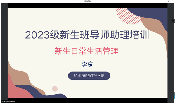 李京以“新生日常生活管理”为主题,详细阐述了严格选拔班导助的目的,担任班导助应具备的基本素质,并就班导助如何树立正确工作理念、提高工作能力提出三点建议:一是班导助应以身作则,充分发挥朋辈力量,在新生中传承优良风气;二是要尽快熟悉新生情况,深入了解新生需求,蓄势赋能,不断获得新生的认同感;三是要帮助新生适应和加快角色转变,有针对性地帮助新生解决各种困惑和不便,促使新生尽快融入大学生活。