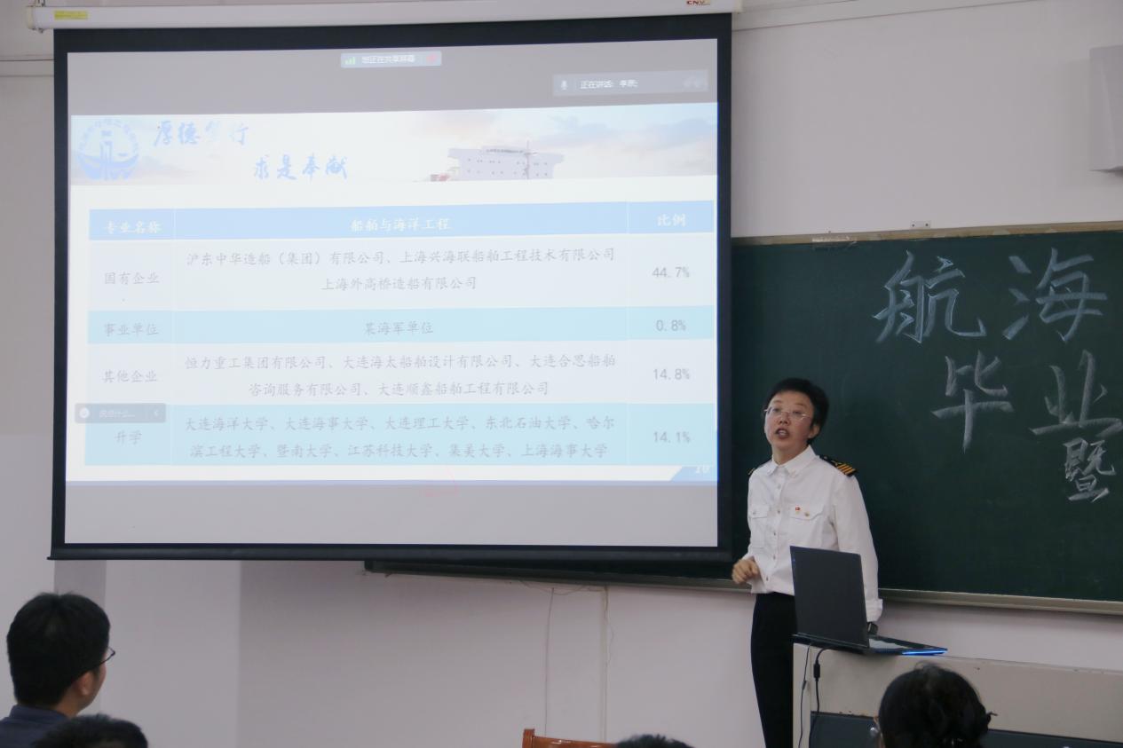 “莫愁前路无知己,天下谁人不识君”。隋江华给予毕业生以下几点建议:一、把握最佳求职期——秋招。二是知己知彼,了解各船东公司的入职要求,工作环境,薪资待遇,从多维度进行评估,选择最适合自己的工作。三是保持良好心态,对就业不焦虑不逃避,及时就业、积极就业。她指出,全体同学要在思想上高度认识就业的重要性,呼吁毕业生主动落实就业,并要求航海类专业毕业生都应争取拿到船员适任证书;要尽早尽快入手,把握就业机遇,早日入职心仪岗位。