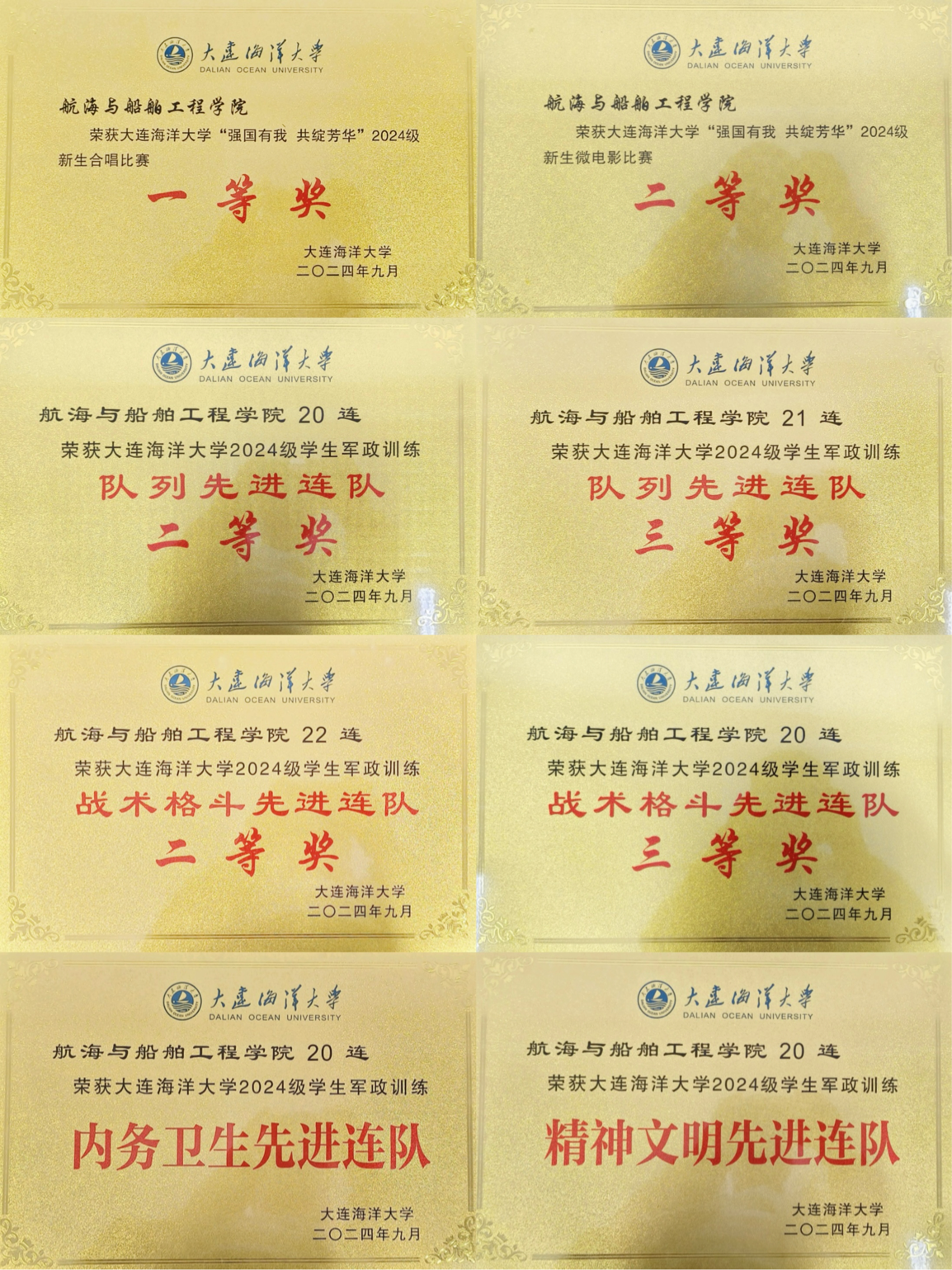 唯有坚持不懈,才会收获累累硕果。在军训成果表彰中,我院在所有表彰项目中均有收获。共荣获新生合唱比赛一等奖,新生微电影比赛二等奖,队列先进连队二等奖、三等奖,战术格斗先进连队二等奖、三等奖,内务卫生先进连队,精神文明先进连队,内务卫生先进宿舍等11项荣誉军训期间,除接受基本的军事训练,我院还开展和组织学生参加了“开学第一课”、消防演练、心理健康教育、爱校荣校教育、反诈骗教育、准军事化管理教育等一系列内涵丰富的活动,引导学生深刻理解“国之大者”的深刻含义,淬炼了航船学子的志气、骨气和底气。