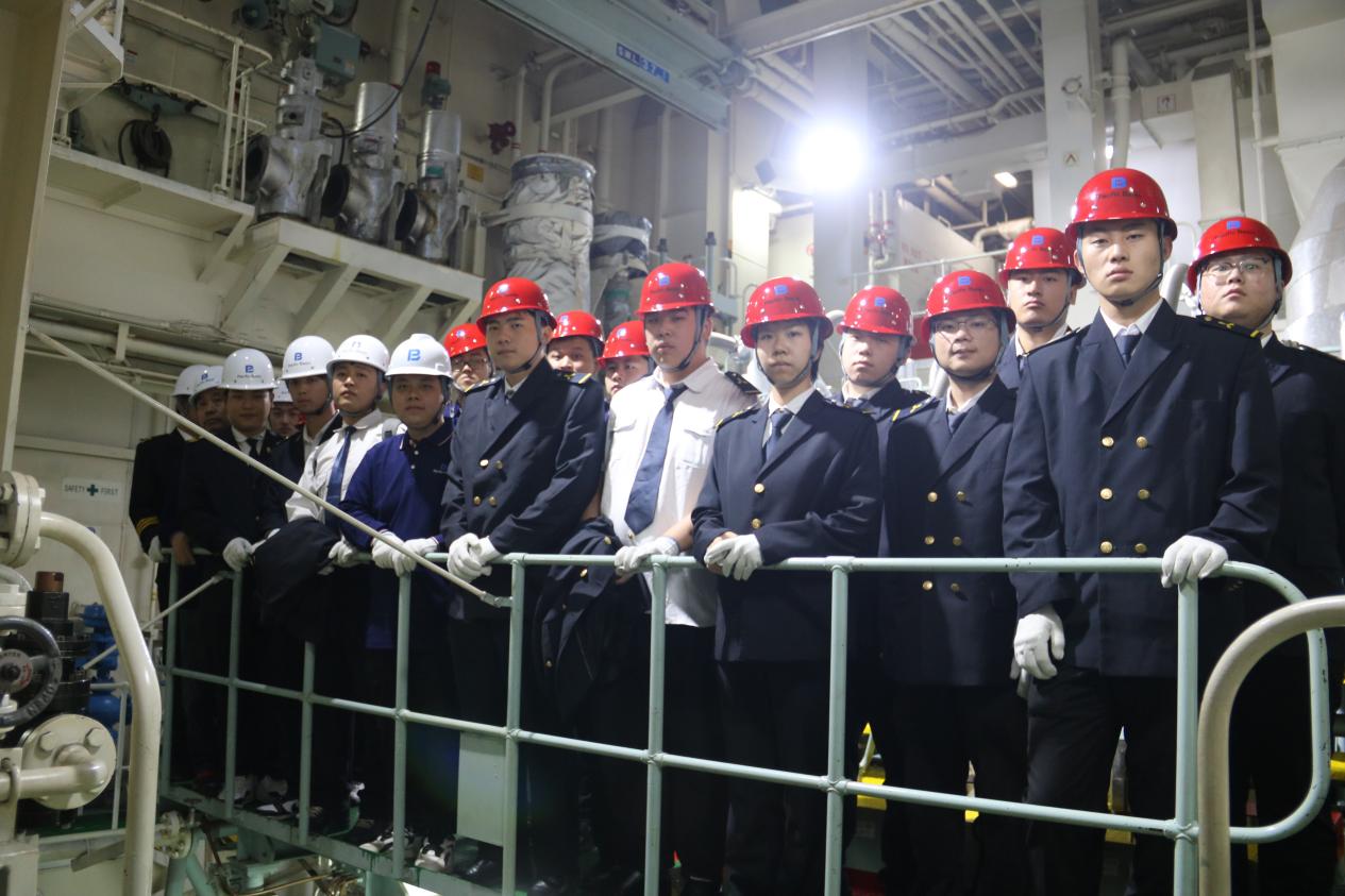 随后,同学们来到了船舶的机舱。机舱内,轰鸣的机械设备、错综复杂的管道,无不展示着现代船舶动力系统的强大与精密。轮机长葛大祥为同学们详细介绍了机舱内各设备的工作原理及日常维护的重要性,让同学们对船舶的“心脏”有了更深的了解。