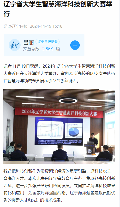 近日,辽宁电视台、大连电视台、辽宁日报、大连日报、央视网、大连政府网和东北新闻网等多家媒体报道我校举办的2024年辽宁省大学生智慧海洋科技创新大赛。本次大赛收到了省内29所高校的519项参赛作品,共有2500余名学生参与。参赛作品涉及水产养殖装备、水下智能机器人、智能图像识别技术等领域,展示了我省学子在智慧海洋领域的无限创意与强劲的创新能力。经过初赛、复赛的激烈角逐,共有80项作品进入线下决赛。决赛中,各参赛队通过PPT路演和实物展示等方式进行汇报。