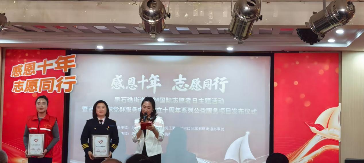 125日,黑石礁街道举办2024国际志愿者日主题活动暨社会组织党群服务中心成立十周年系列公益服务项目发布仪式,陈禹娜书记代表的麻豆传媒 青年志愿服务队获得了“最美志愿服务团队”的光荣称号。