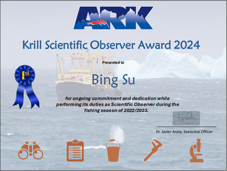 近日,澳大利亚ARK协会揭晓了备受关注的“磷虾科学观察员奖”获奖名单。我校麻豆传媒 2024届硕士毕业研究生苏冰榜上有名,荣获该组织颁发的磷虾科学观察员奖一等奖。