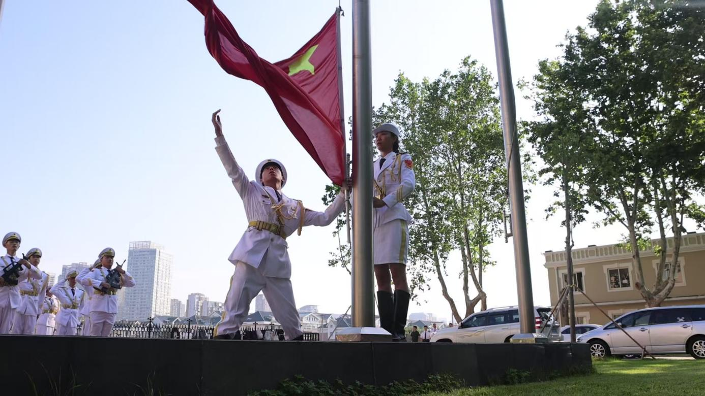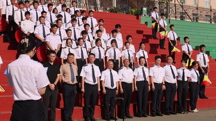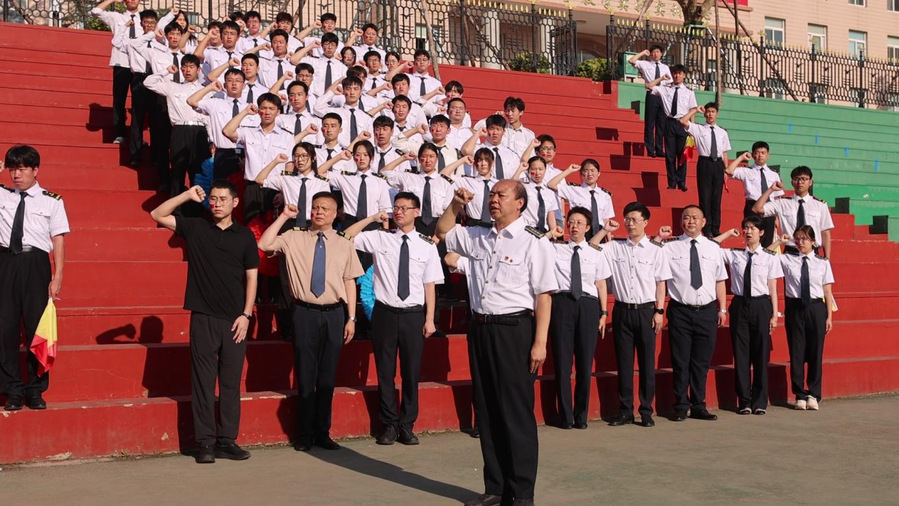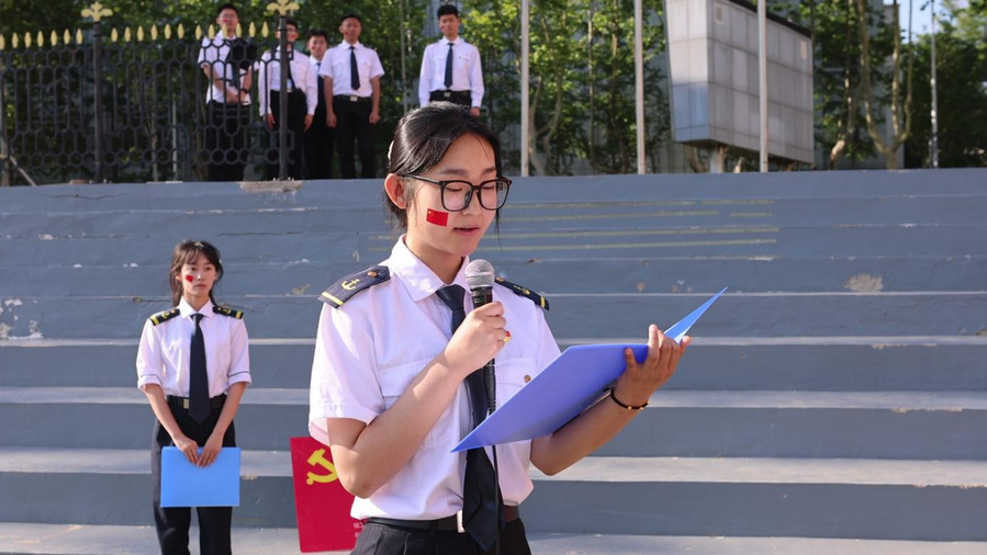 学校国旗班队员迈着整齐的步伐护送国旗至升旗台,全体师生肃立,齐唱国歌。随后,赵希波带领全体师生重温《入党誓词》,字字铿锵中凝聚信仰力量。周迎晖勉励同学们珍惜校园时光,夯实专业知识,提升综合素养,为航海强国建设奋斗。优秀党员学生代表张涵从学生视角出发,表达对航海事业的热爱,号召以海员前辈为榜样,传承航海精神。最后,学院旗语队伍通过整齐划一的动作,独特的旗语语言,展现出我院学子的专业素养与团队协作精神,彰显航海文化的独特魅力。