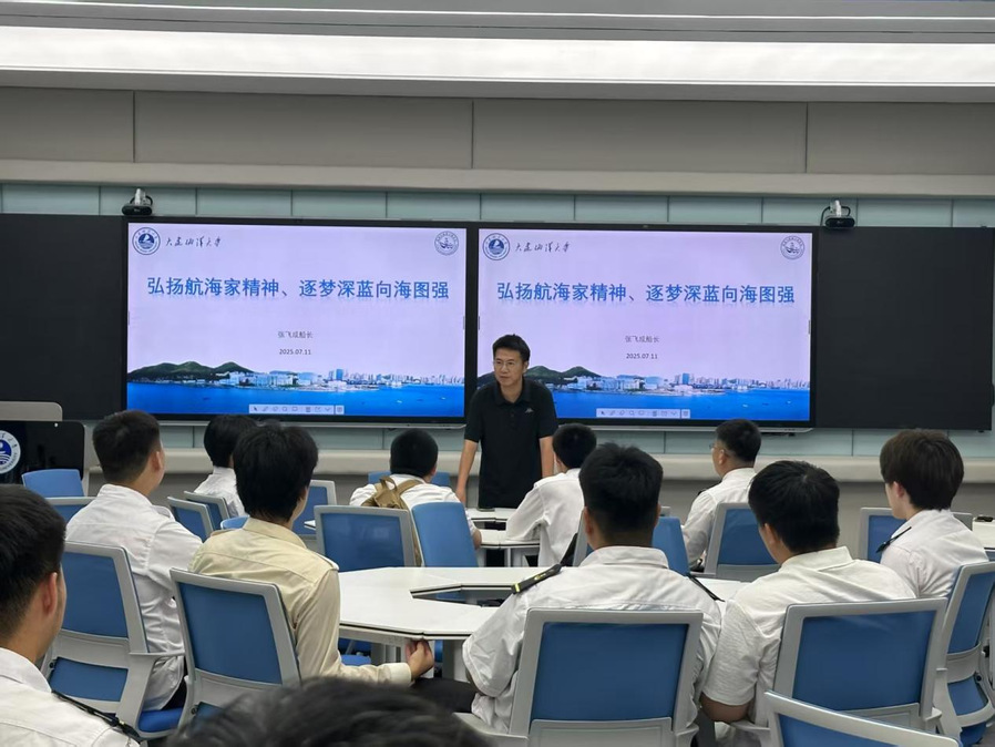 张飞成以“弘扬航海家精神、逐梦深蓝向海图强”为题,分享了一线经历,让在场师生深受触动。这些亲身经历生动诠释了中央八项规定精神在航海实践中的落地:务实,是台风中精准操作的每一个指令;自律,是面对诱惑时坚守的职业底线;协作,是跨越风浪时紧握的双手。“作风不是口号,是甲板上的每一步巡检,是航海日志里的每一个数据,是危急时的每一次担当。” 张飞成的分享让抽象的“作风建设” 变得可感可学。