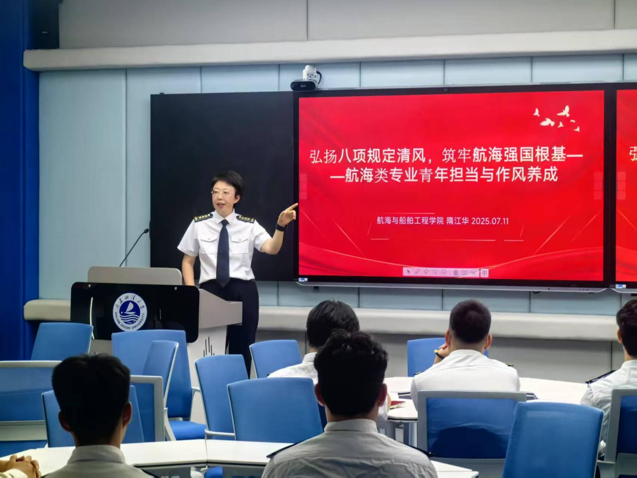 隋江华从中央八项规定精神对航海类学子成长的“导航”价值切入,以“弘扬八项规定清风、筑牢航海强国根基”为题为学生讲了一次党课。她强调要在工作中脚踏实地,不断提升自己的专业技能,积累丰富的实践经验,将海洋强国建设的目标放在首位。在专业学习中求真知、在实践实训中练真功、在职业发展中守底线。
