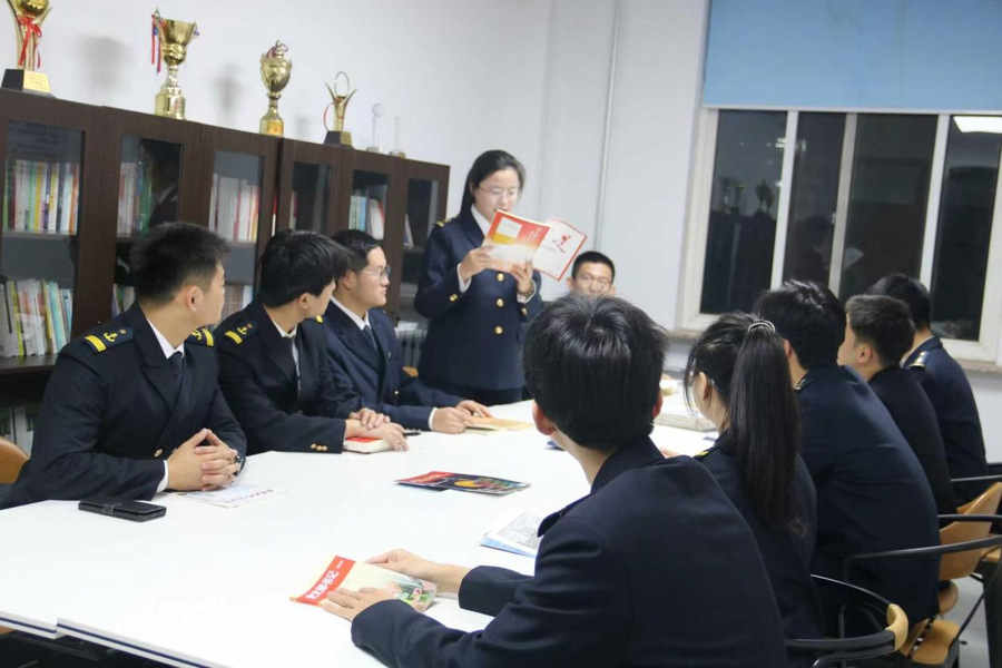 分享环节中,高靖轩同学围绕《毛泽东选集》中的实践观与群众路线,结合航海人严谨求实的专业精神,畅谈新时代青年如何将理论转化为行动力。王尉同同学则以“红船精神”为核心,从中共一大的历史讲起,结合学院的专业特色,阐释了“红船启航、巨轮远航”的深刻内涵。两位同学的精彩发言引发共鸣,现场互动气氛热烈。分享结束后,参会同学以共读经典读物和专业书籍开展“书海共读”,在墨香中交流心得、碰撞思想。